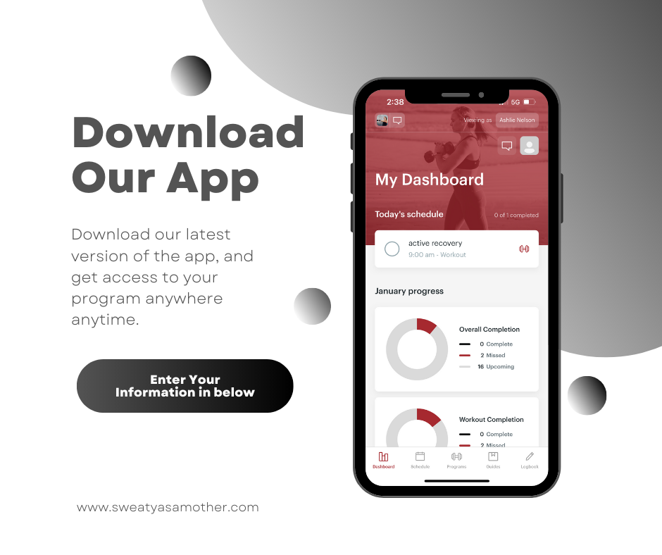 Welcome to the Sweaty as a Mother Family! Enter your information in below—use voucher code “8 weeks” or “12 weeks” depending on which program you purchased. This will create you an account on the Sweaty as a Mother app! From there Taylor, will send you an email with your login information —so be on the lookout for an email after you submit!
